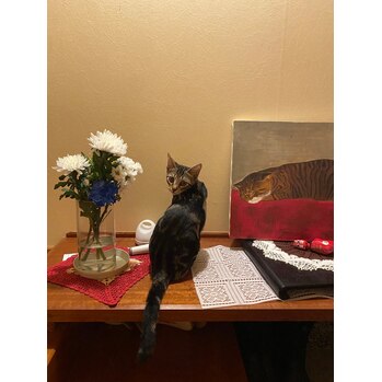 こんにちは、みかです(^▽^)/ 少し前に投稿させてもらった、実家の子猫ですがもうこんなに大きくなりました! 女の子ですが、とってもやんちゃで元気いっぱいです!(^^)!(赤べこが倒れているのも、この子の仕業です…) でも寒くなってきて、膝に乗ってきたりみんなと同じ布団で寝たがったりと可愛い一面に家…